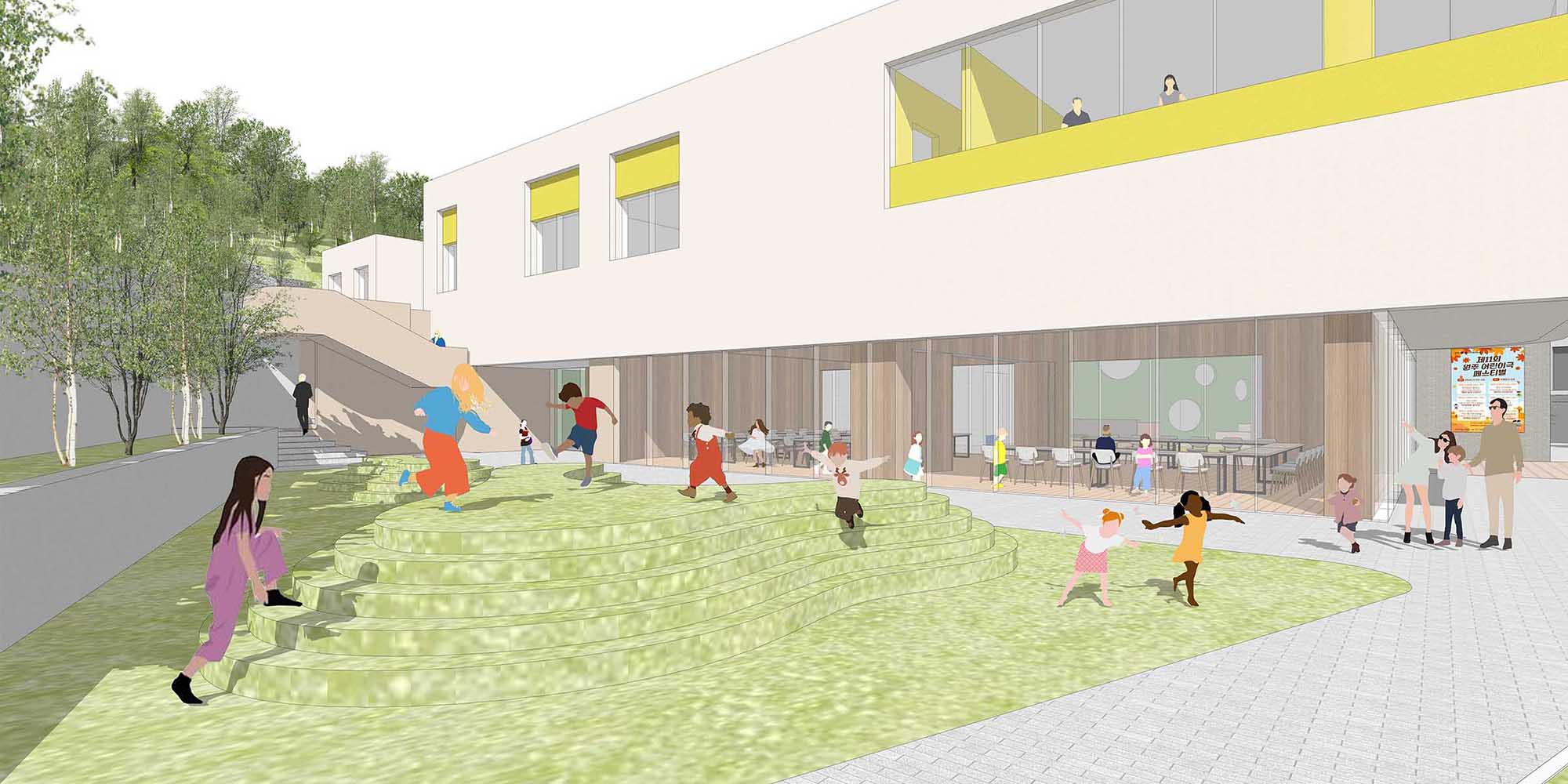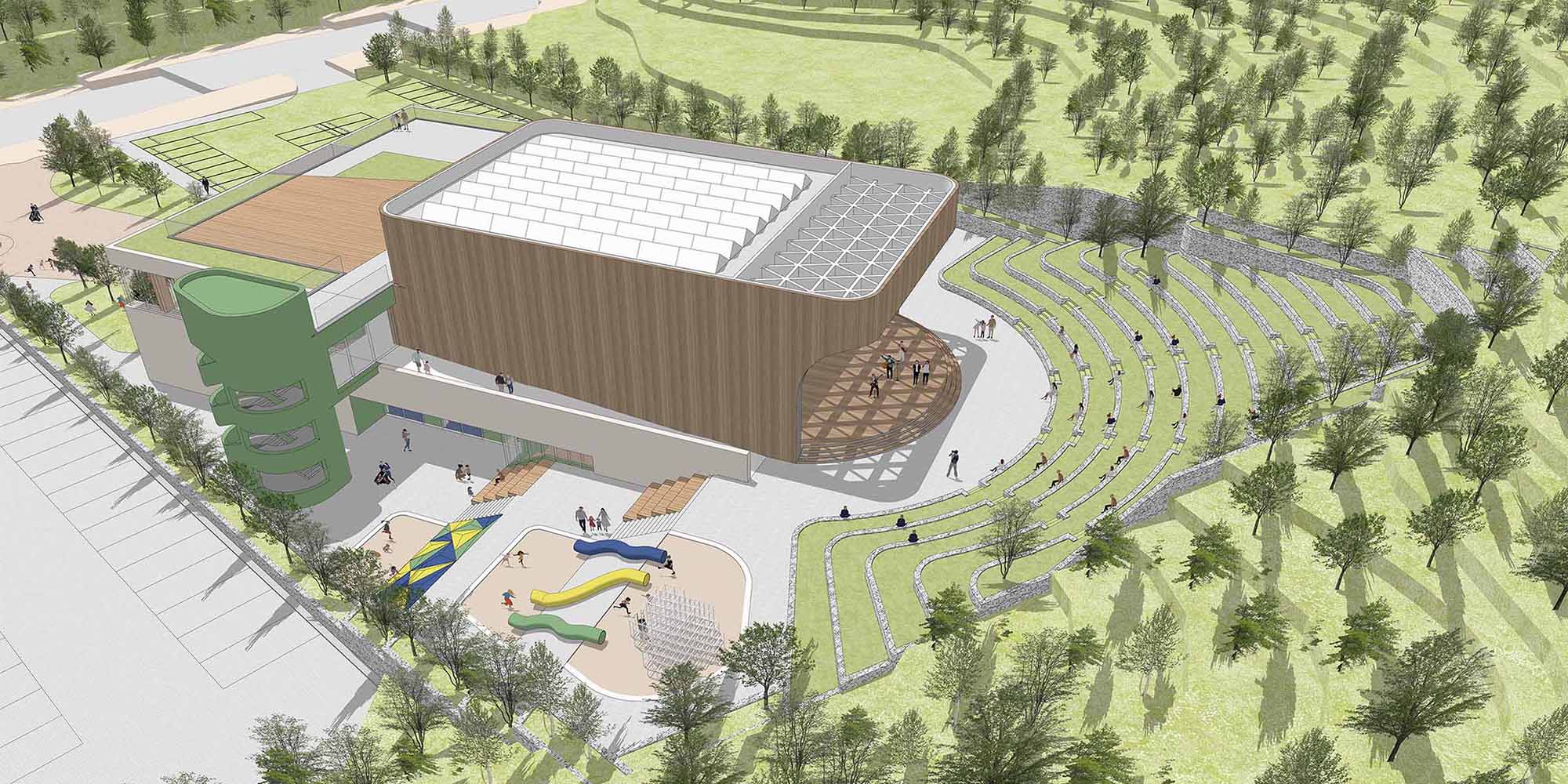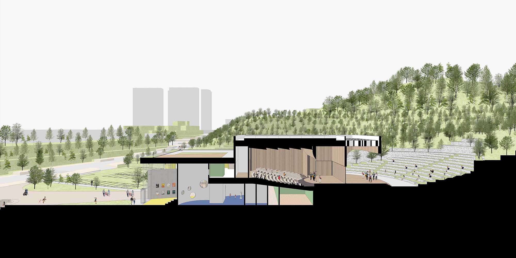 전면 광장에서 시작해 1층 공공 거실과 그랜드 스텝, 2층 실내 공연장, 뒤편의 숲속 야외공연장까지 하나의 공연 축이 이어지도록 계획한다. 건물은 도로 쪽 소음을 차단하는 벽이 되며, 야외공연장은 숲 안쪽으로 배치해 소리가 주변으로 직접 퍼지지 않도록 했다. 내부의 높이 차는 경사놀이터와 계단, 스탠드로 흡수되어, 아이들의 놀이와 이동, 관람이 한 단면 안에서 자연스럽게 겹쳐지는 입체적인 경험으로 이어진다.