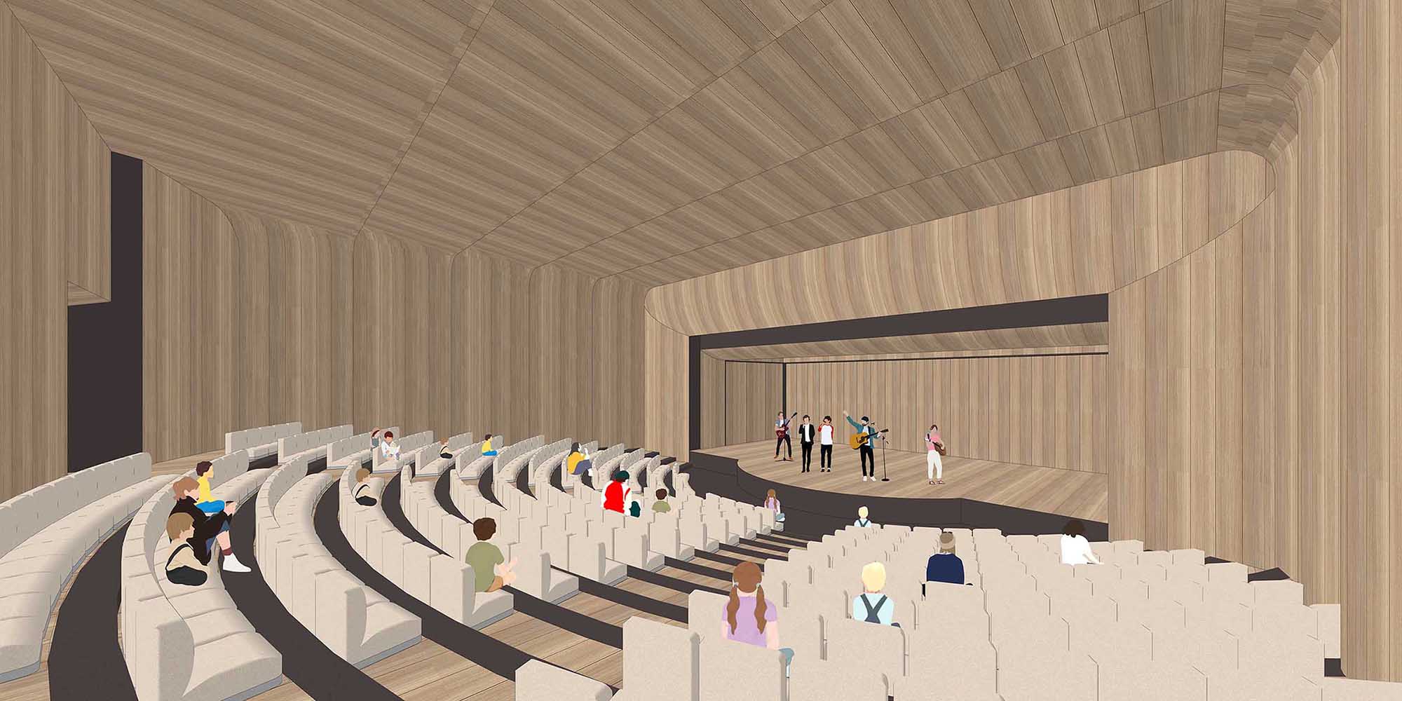 실내 무대의 뒤편이 열리면, 공연은 숲속 야외무대까지 자연스럽게 이어진다. 도시에 면한 객석과 숲을 배경으로 한 관객이 하나의 장면을 공유하며, 무대의 안과 밖, 일상과 축제가 자연스럽게 만난다. 아이들이 쉽게 오르내릴 수 있도록 단을 낮게 계획하고, 관람석은 푹신한 쇼파형 좌석으로 구성해 어린이에게 편안한 공연 경험을 제공한다.