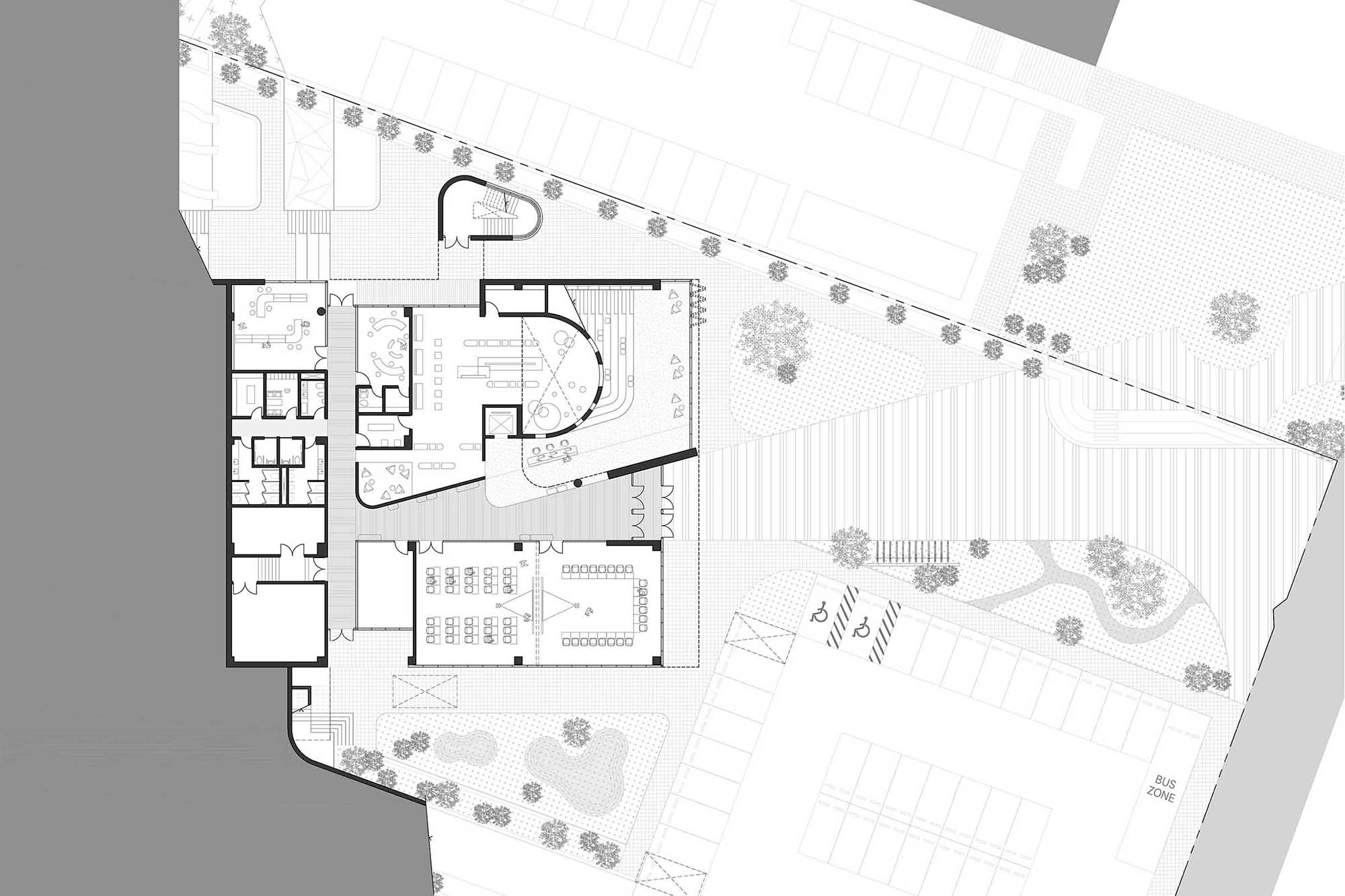 넓은 지상주차장과 야외공연장을 확보하는 동시에 원활한 서비스 동선과 의미 있는 외부공간을 만들기 위해, 건물을 도로와 대지 경계에 평행하게 두지 않고 사각형 매스의 축을 비틀어 배치했다. 이로써 전면광장·놀이터·마당은 주차장 축에서 벗어난 독립적인 외부 무대로 구성되고, 북·서측의 자연 경사는 야외공연장의 객석과 경사놀이터로 흡수된다. 또한 남측에는 사무실과 프로그램실, 외부마당을 두어 채광과 개방감에 유리한 조건을 확보한다.