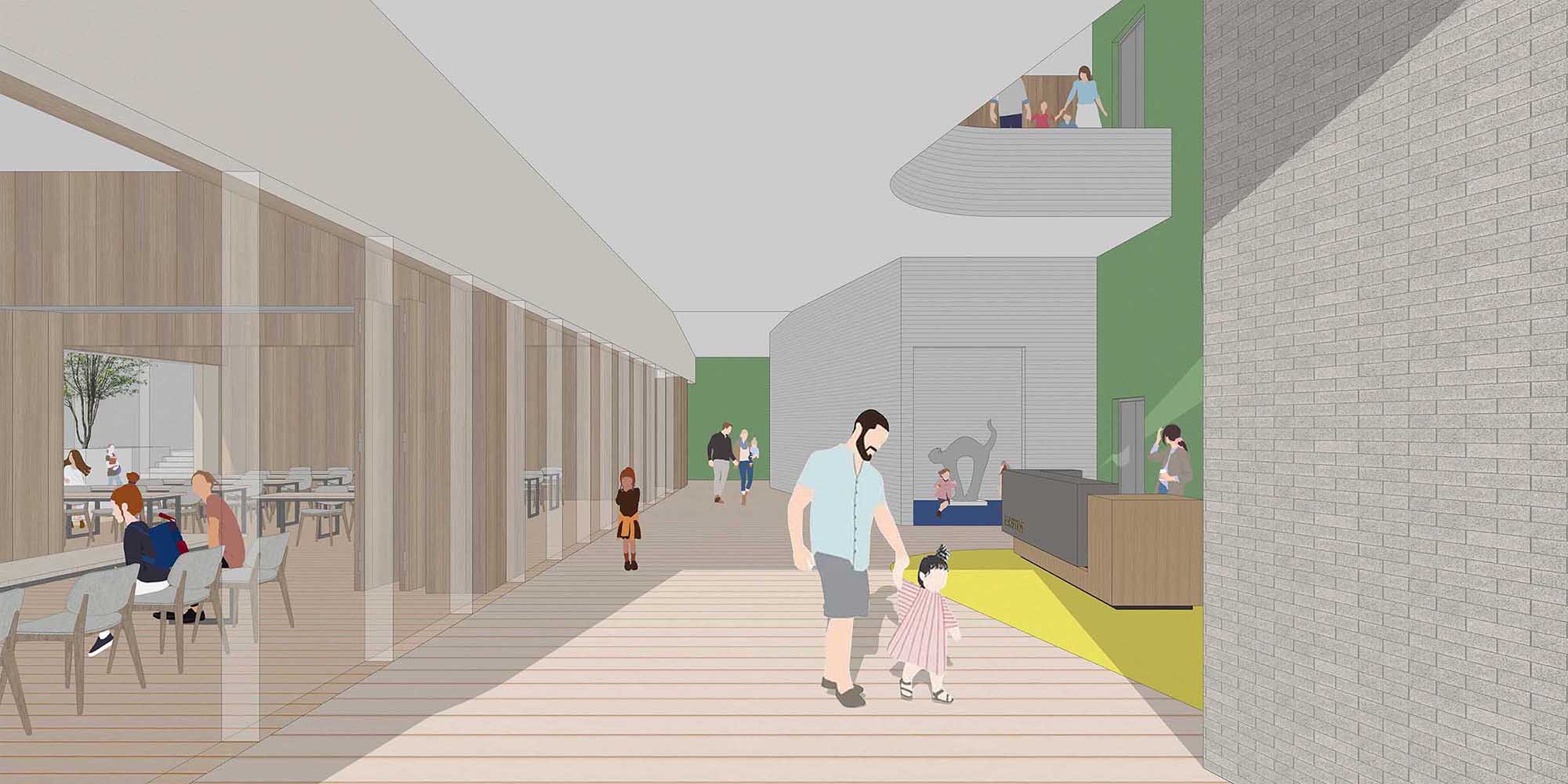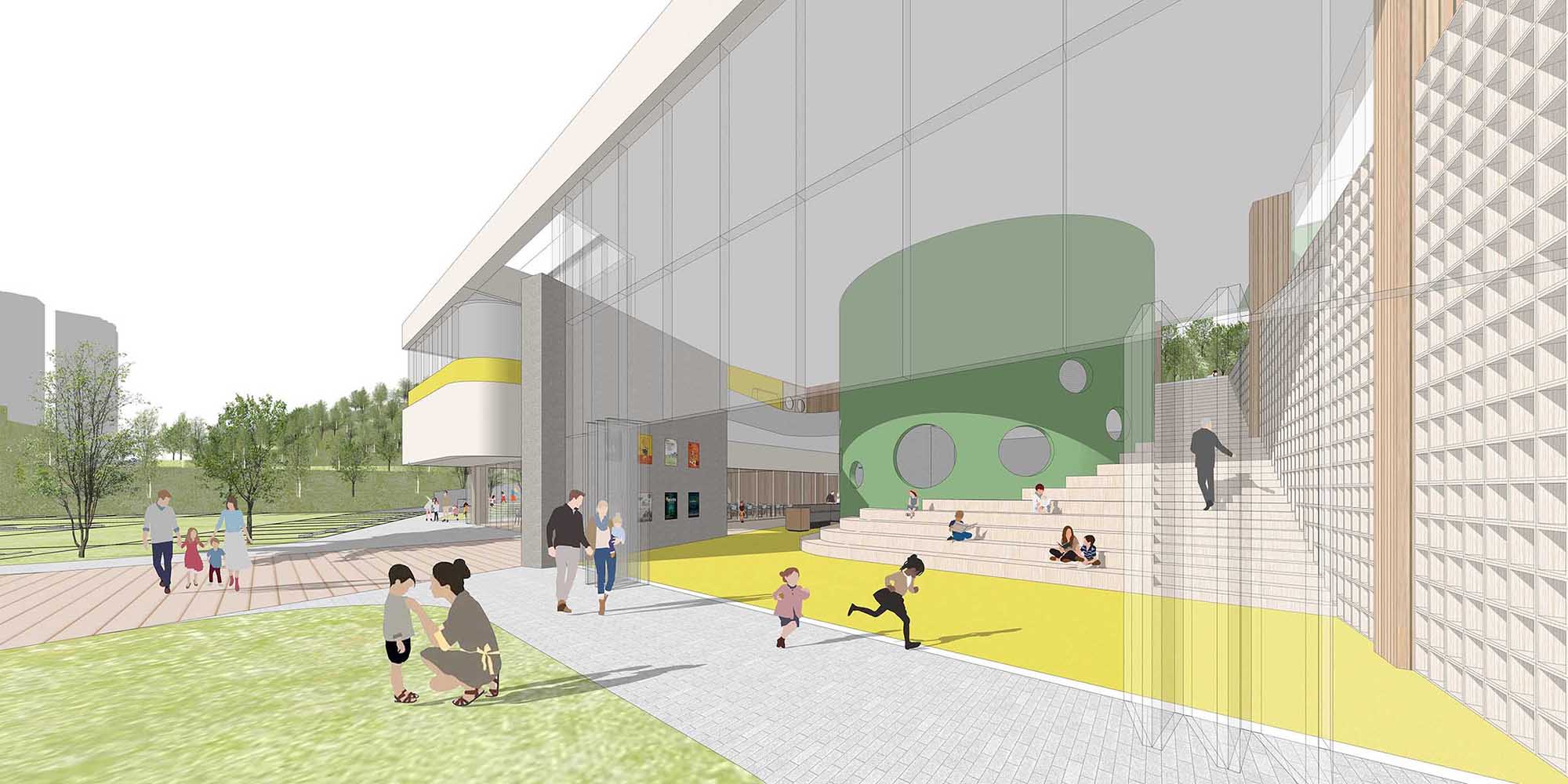 1층은 북카페, 그랜드 스텝, 교육실, 전시·어린이 공간을 따라 전면광장과 잔디마당, 잔디놀이터, 경사놀이터가 자연스럽게 이어진다. 실내 프로그램은 각 공간 앞에 놓인 외부 마당으로 확장되며, 아이들과 가족, 마을 주민이 함께 머무는 일상의 생활 무대를 만든다. 어린이예술회관의 하루는 이 1층에서 시작된다. 언제든 편하게 드나들 수 있는 공공의 거실이자, 도시와 숲을 잇는 출발점이 되도록 계획한다.