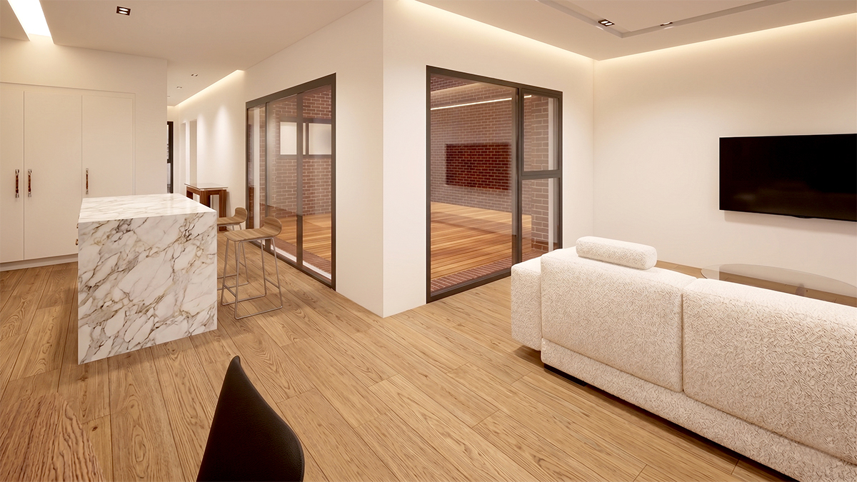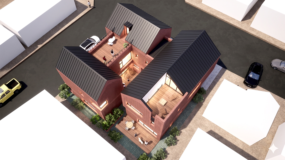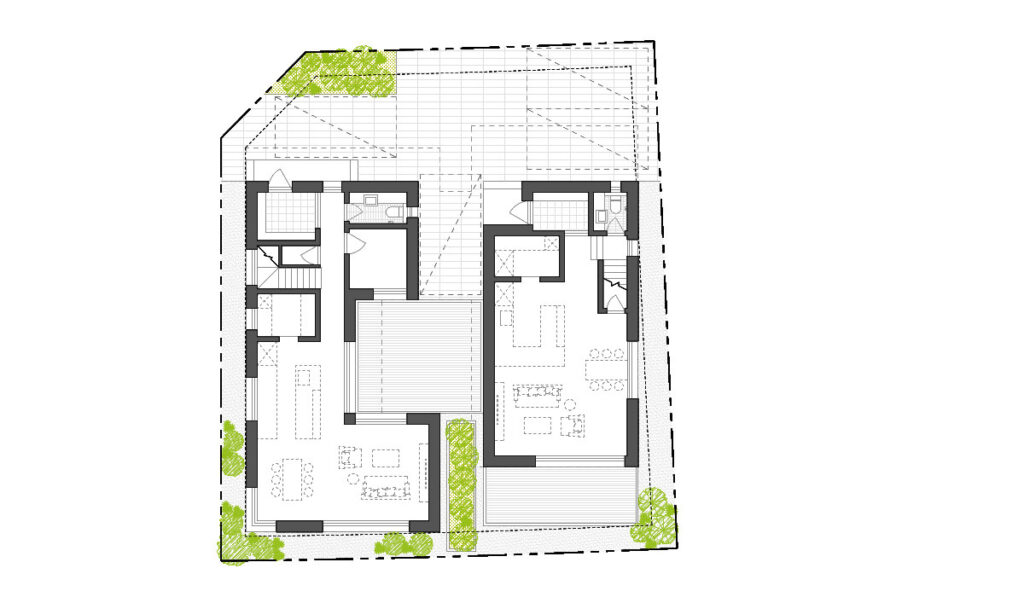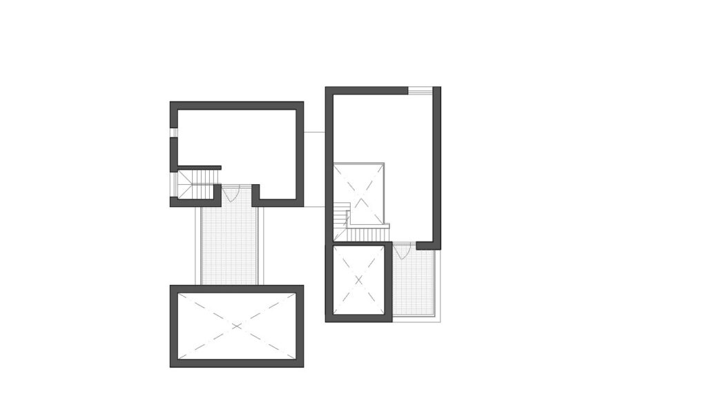 두 세대의 진입 동선을 완전히 분리해 서로의 생활을 침범하지 않도록 했다. 동시에 두 세대 모두 다락을 통해 추가 면적과 활용성을 확보하고, 한쪽은 중정형 마당을, 다른 한쪽은 뒷마당을 갖도록 구성했다.