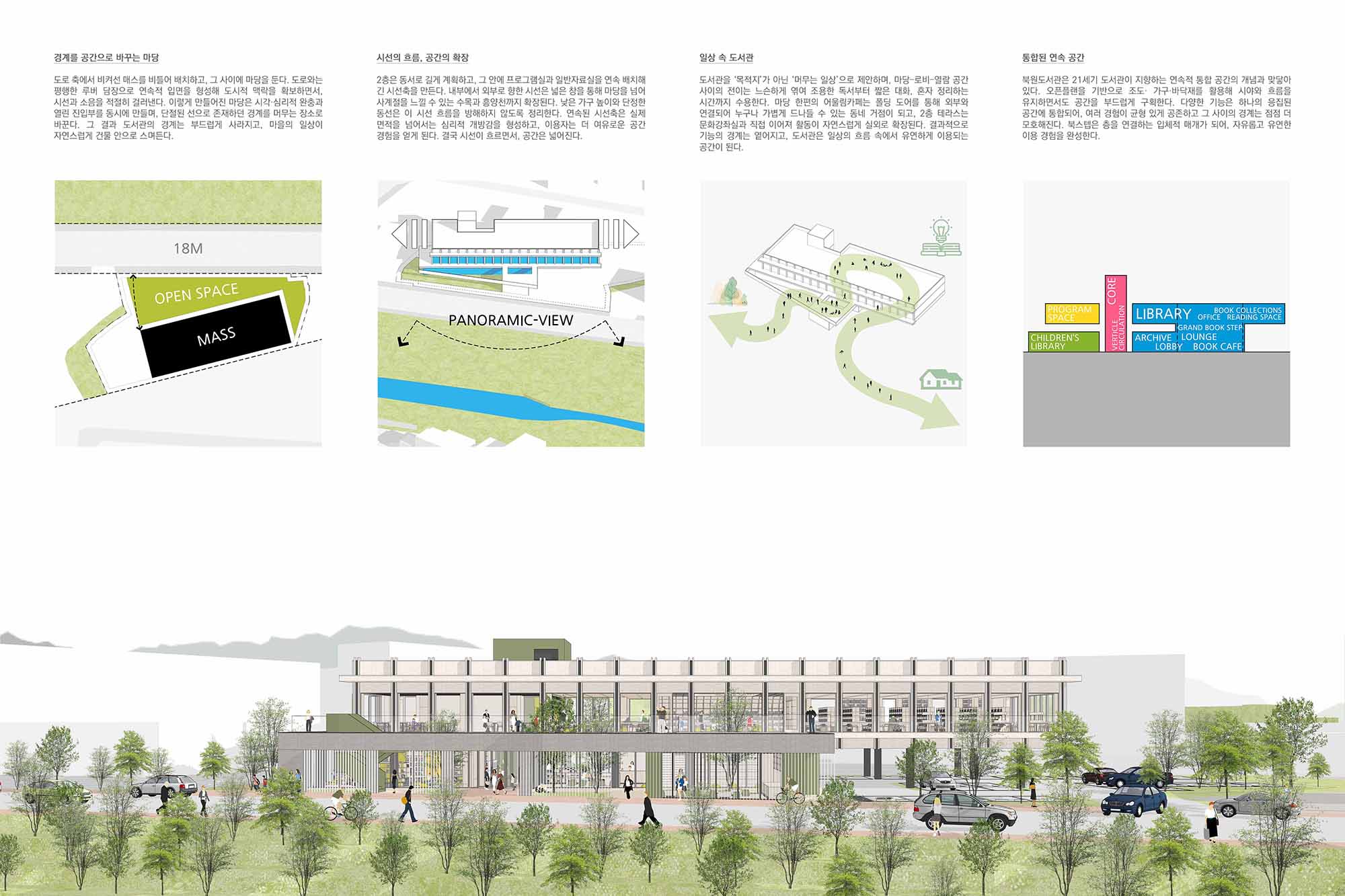 북원도서관은 마당을 품은 일상형 도서관이다. 익숙한 안마당처럼 마련된 마당은 삶의 다양한 장면에 자연스럽게 배경이 되며, 건물과 마을 사이의 경계를 느슨하게 풀어준다. 도서관은 마을을 향해 열려 있으면서도 루버 담장으로 아늑함을 유지해, 이용자는 실내외 어디서나 책을 읽고 커피를 마시며 생각을 정리하고 대화를 나눌 수 있다. 우리는 이곳을 단순한 독서 공간을 넘어 누구나 편안히 머무는 장소로 제안한다.