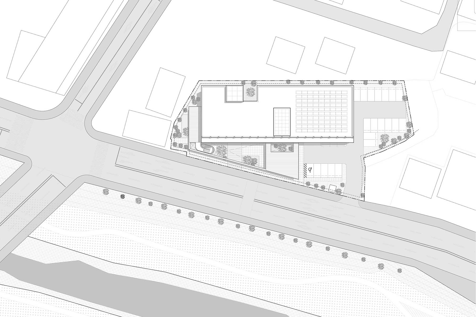 도로에 평행하지 않게 매스를 비틀어 배치함으로써, 가로변에서의 인지성을 높이고 도서관의 첫인상을 또렷하게 만든다. 긴 루버 담장은 거리와 나란히 놓이며, 도시 흐름에 조용하면서도 보행자의 눈높이에 맞춘 스케일을 형성한다. 차량과 사람, 도시와 건물 사이의 경계는 이 완충된 여백을 통해 자연스럽게 조율된다.