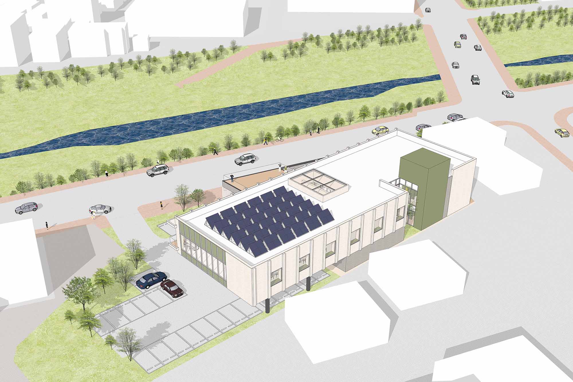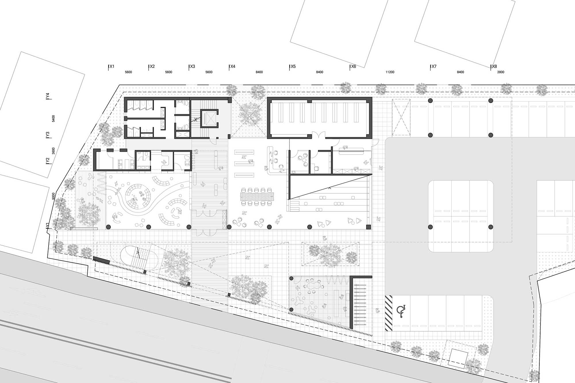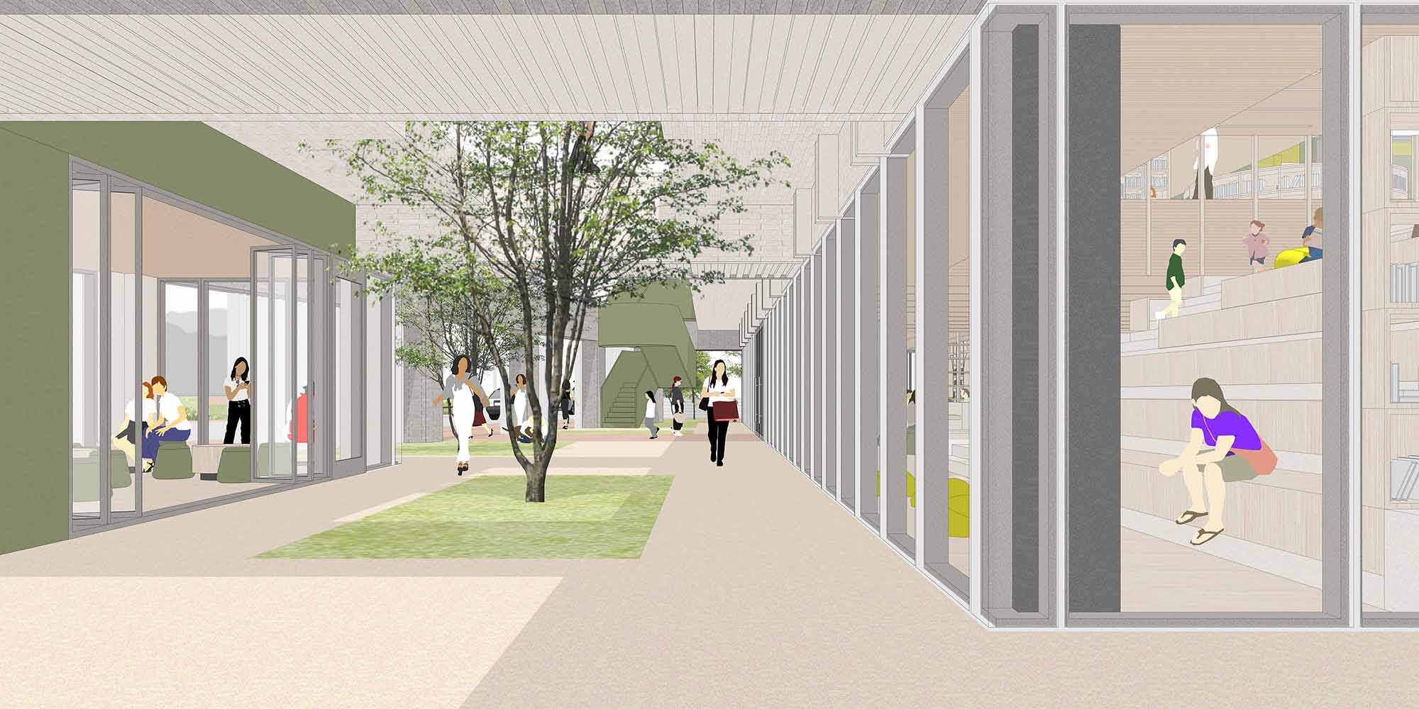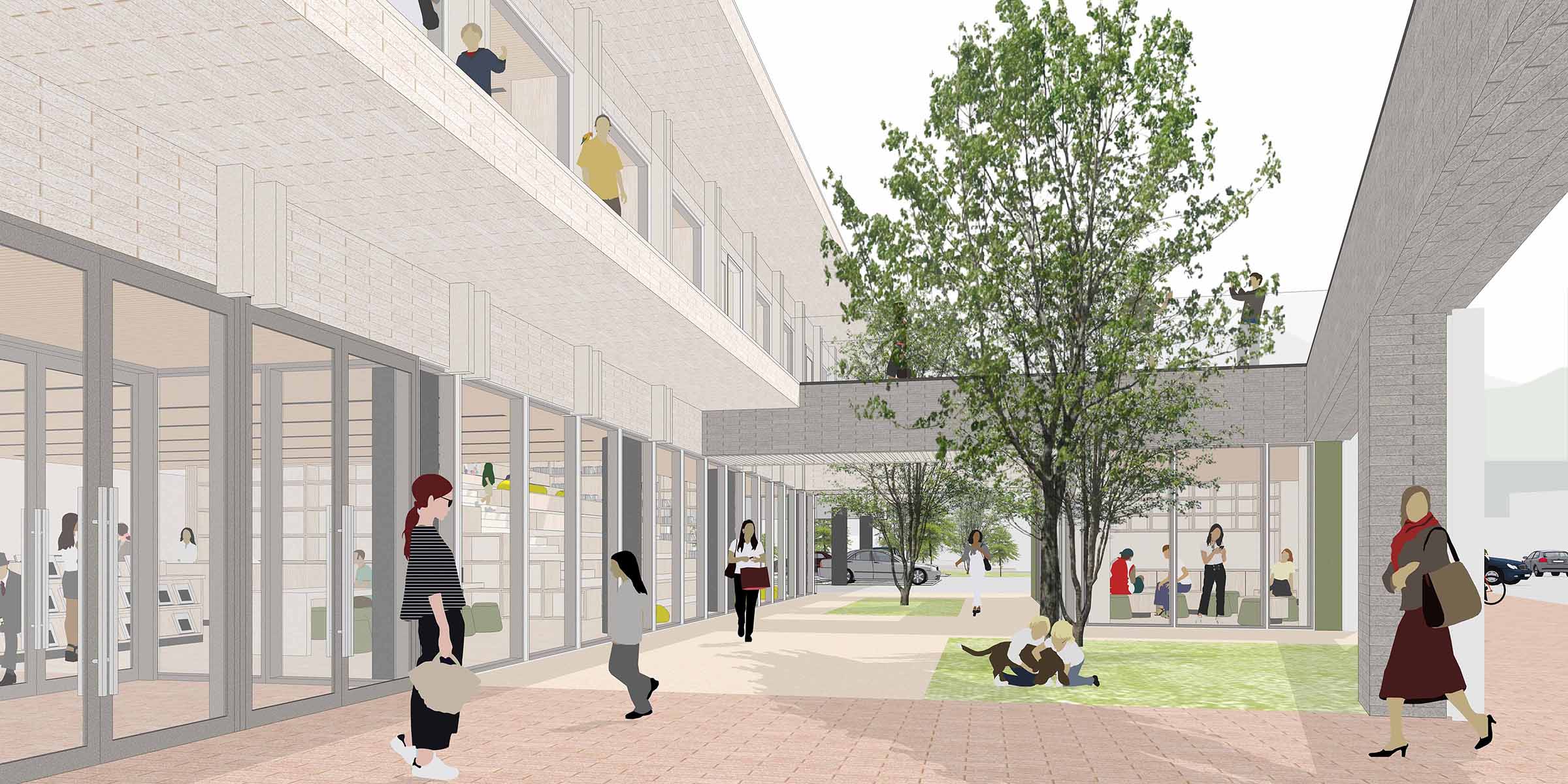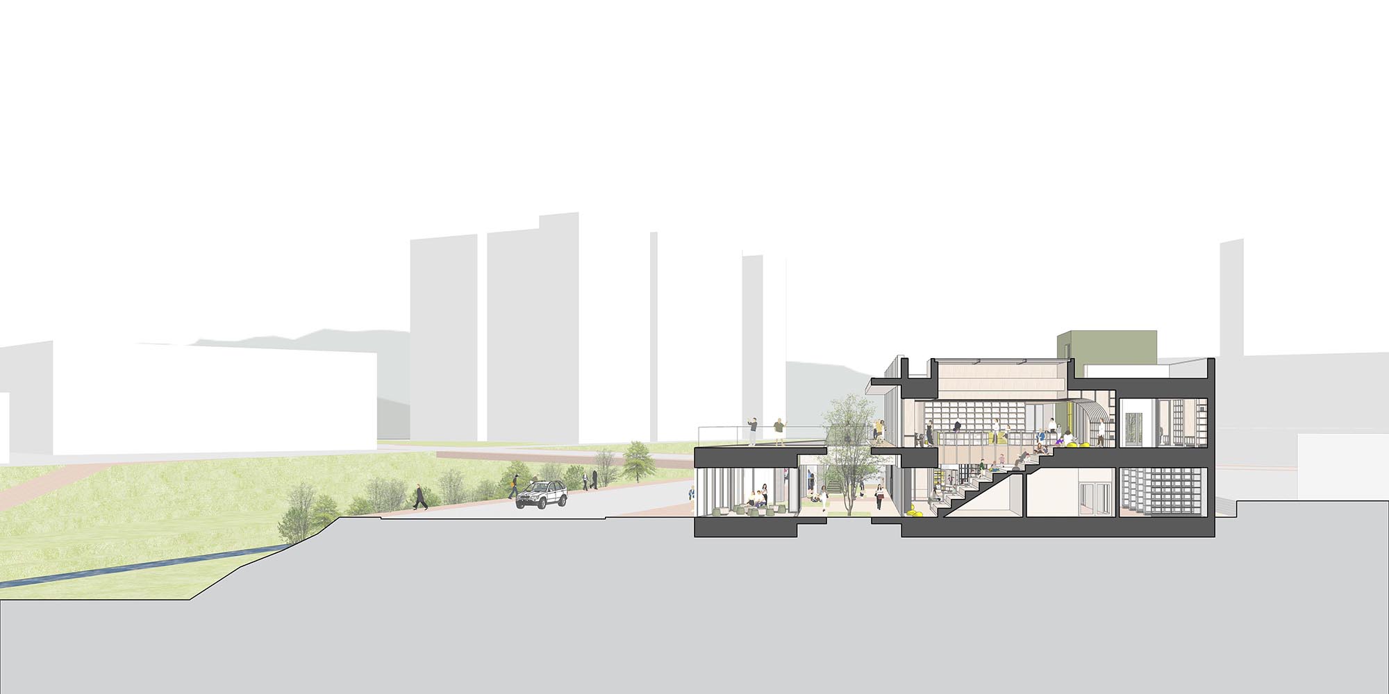비틀린 매스와 전면의 마당은 도로 측 수직 루버와 함께 생활가로의 흐름에 응답하며 도시적 입면을 만들어낸다. 차량 동선은 교차로에서 멀리 떨어뜨려 안전성과 효율을 높였고, 동서 방향으로 길게 뻗은 2층 매스는 북측 하천의 풍경을 끌어들이며 보행자에겐 낮은 스케일과 느슨한 경계로 열린 접근을 유도한다. 담장과 건축 사이의 틈은 어울림카페, 북테라스, 어린이책정원이 자연스럽게 이어지며, 머무르고 걷는 일상의 장면을 품는 열린 배치를 형성한다.