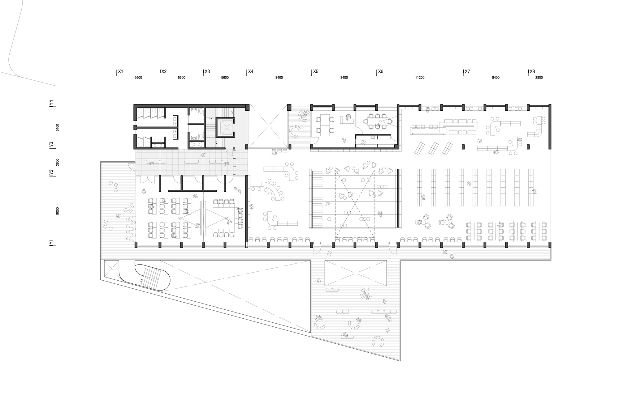 출입구와 안내데스크 앞에 여우 공간을 두고, 라운지형 가구와 이동식 큐레이션 월을 배치해 만남, 대기, 가벼운 열람이 가능하다. 필요 시 소규모 행사나 전시를 위한 플렉시블 무대로 전환된다.
