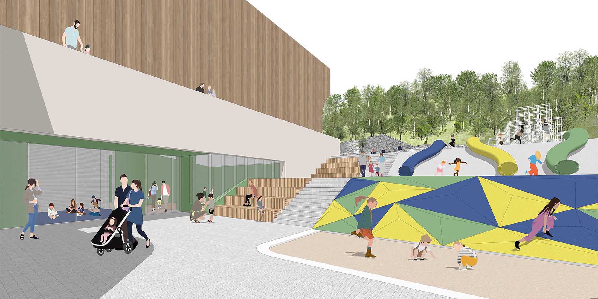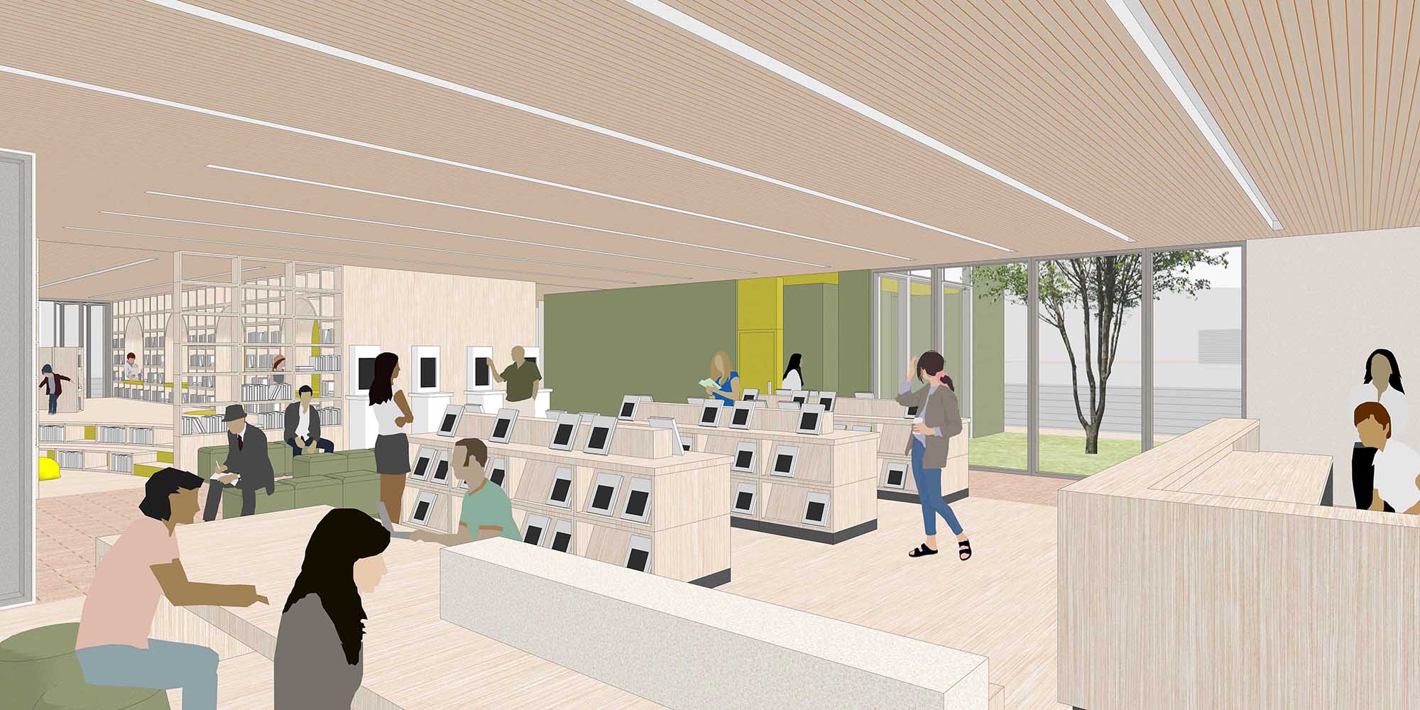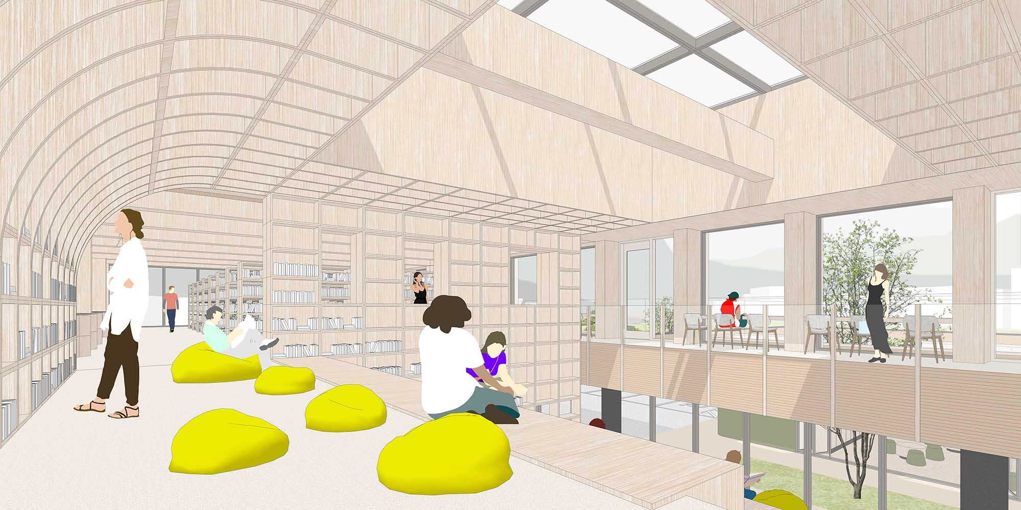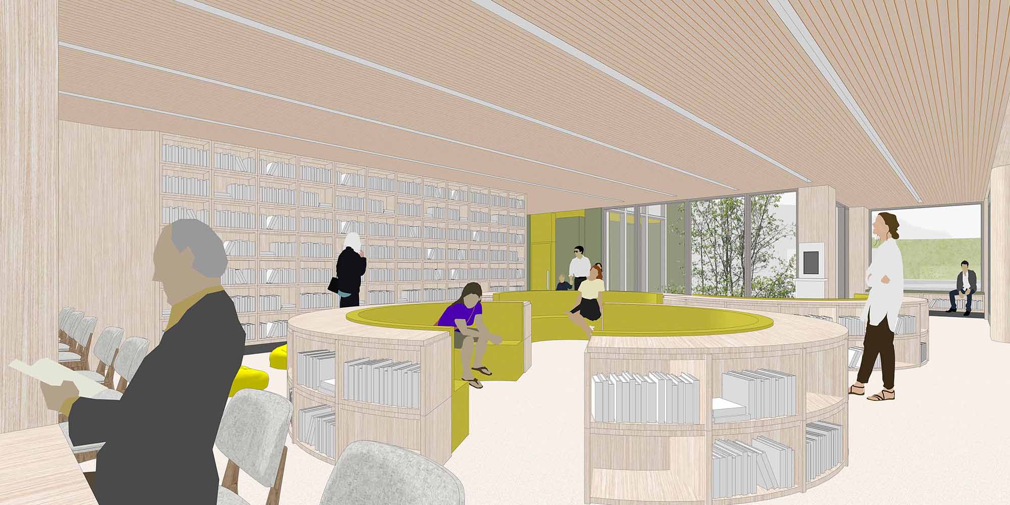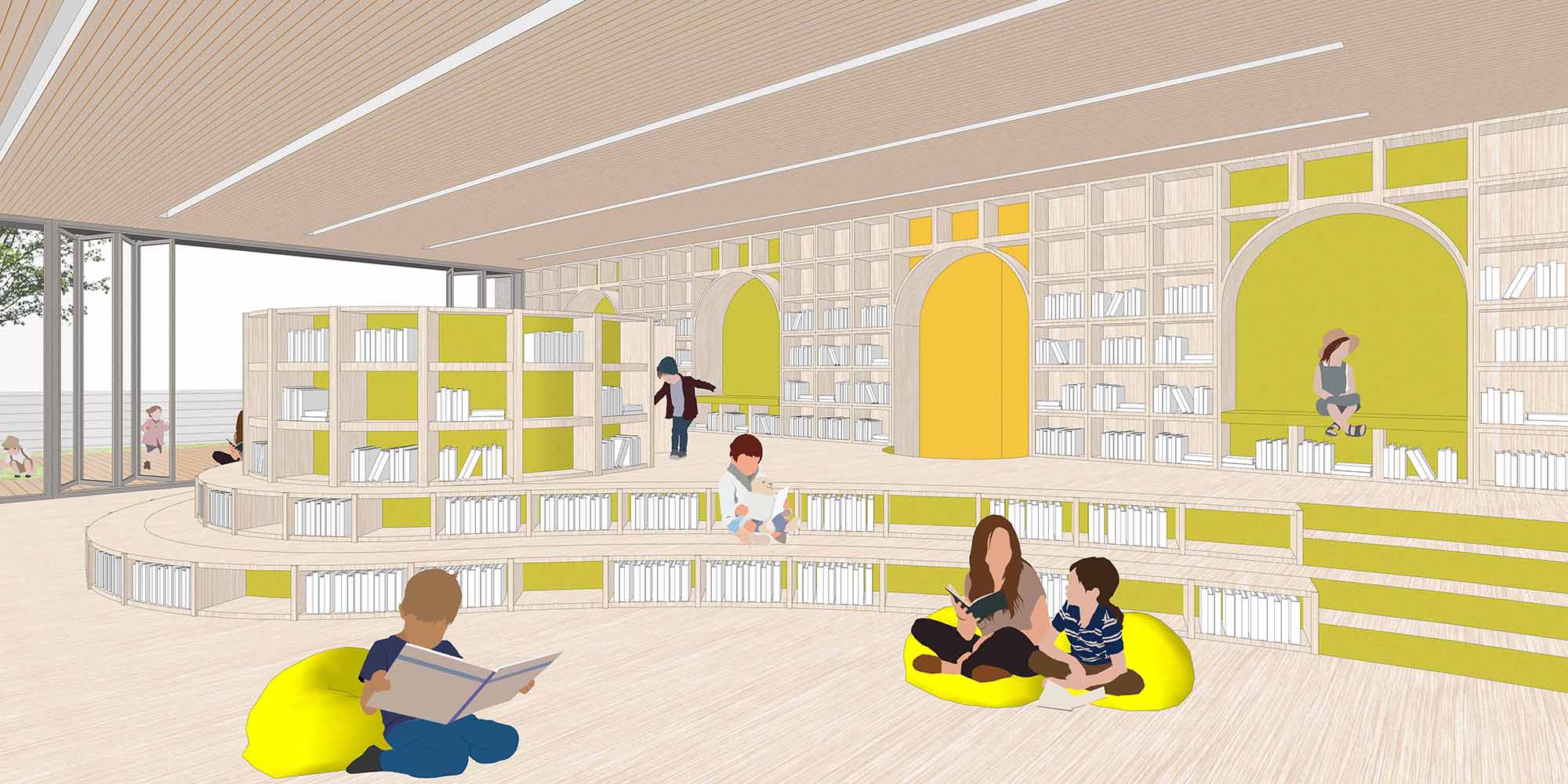 따뜻한 우드 소재에 파스텔 색상을 포인트로 더해 밝고 안정적인 분위기를 만든다. 낮은 서가는 아이들의 눈높이에 맞춰 배치하며, 유아존-열람존-작은 이야기방은 유모차와 보호자 동선과 나란히 배치해 시야 확보와 접근성을 함께 고려한다.
