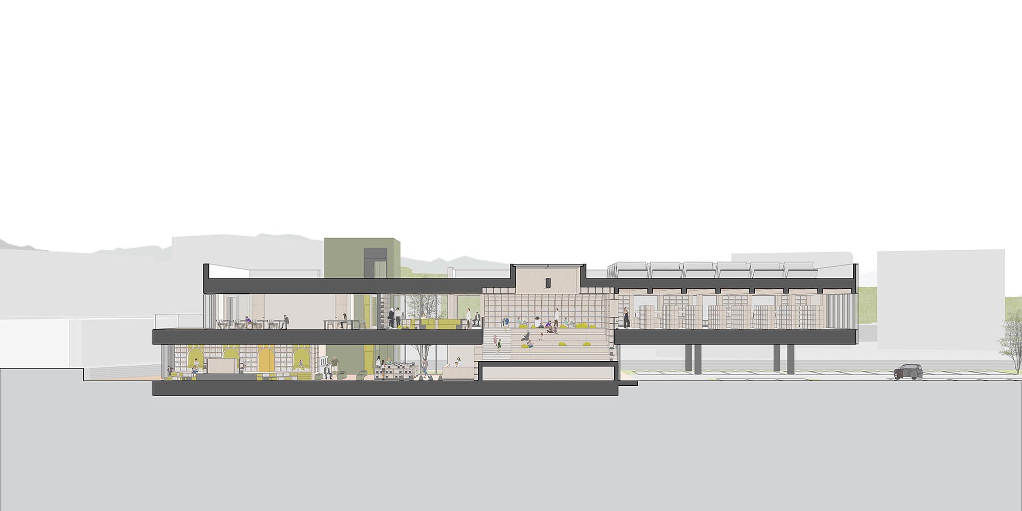 낮고 넓은 계단형 스텝을 활용해 앉거나 기대어 책을 읽을 수 있는 편안한 열람 공간을 조성한다. 평상시에는 누구나 머물며 책을 볼 수 있는 열린 자리로, 행사 시에는 약 60~80명 규모의 작은 강연장으로 변형이 가능하다.