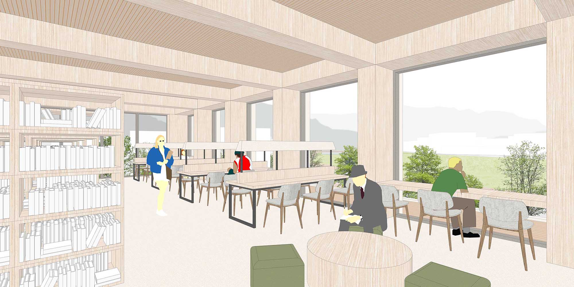 창가를 따라 저상 데스크와 높은 바를 배치해 시야가 트이는 집중 좌석대를 구성했다. 목재 루버와 흡음 마감재로 잔향을 줄이고, 조명과 콘센트를 갖춘 1인 열람 환경을 제공한다.