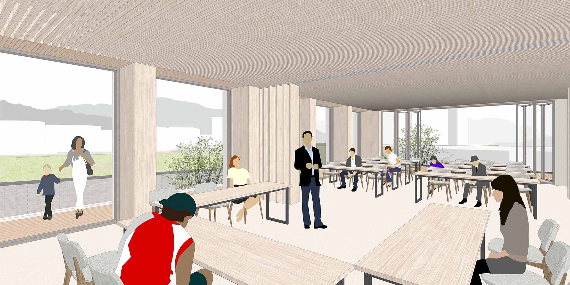 가변 파티션으로 두 실을 통합해 강의, 상영, 워크숍 등 다양한 활용이 가능하다. 테라스와 연결해 환기와 휴식이 자연스럽게 이어지고, 전면 보드·빔·수납 일체화로 세팅이 간편하다. 야외 활동과 연계한 프로그램 운영도 가능하다.