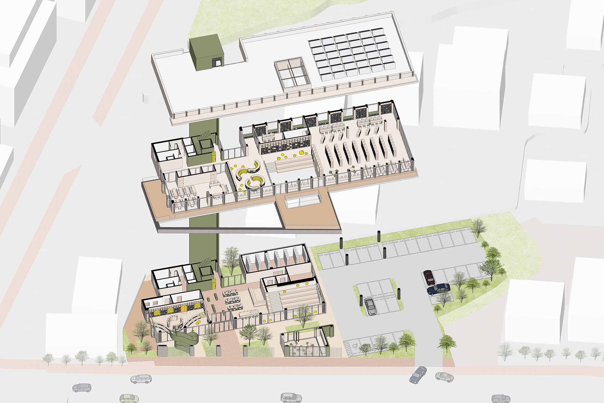 주어진 주차 대수를 지상에 수용하기 위해 필로티 구조로 비워 열린 저층부를 형성한다. 도서관 프로그램은 3층으로 나누기보다 2개층 오픈플랜으로 구성해 1층과 2층이 시각적·공간적으로 하나의 층처럼 호흡하도록 계획했다. 중심에 위치한 북스텝은 천창을 통해 자연광을 실내 깊숙이 끌어들이고, 수직의 빛길은 수평·수직 동선을 따라 공간을 관통하며 연속된 시야를 만든다. 이를 통해 방문객은 내부와 외부, 상하층의 관계를 시각적으로 인지하고, 하나의 연속된 공간으로 체험할 수 있다. 단순한 매스 구조 속에서도 곳곳에 마련된 테라스는 프로그램의 외부 확장을 가능케 하며, 일상적인 이용 속에서도 열림과 머무름이 공존하는 입체적 단면을 만들어낸다.